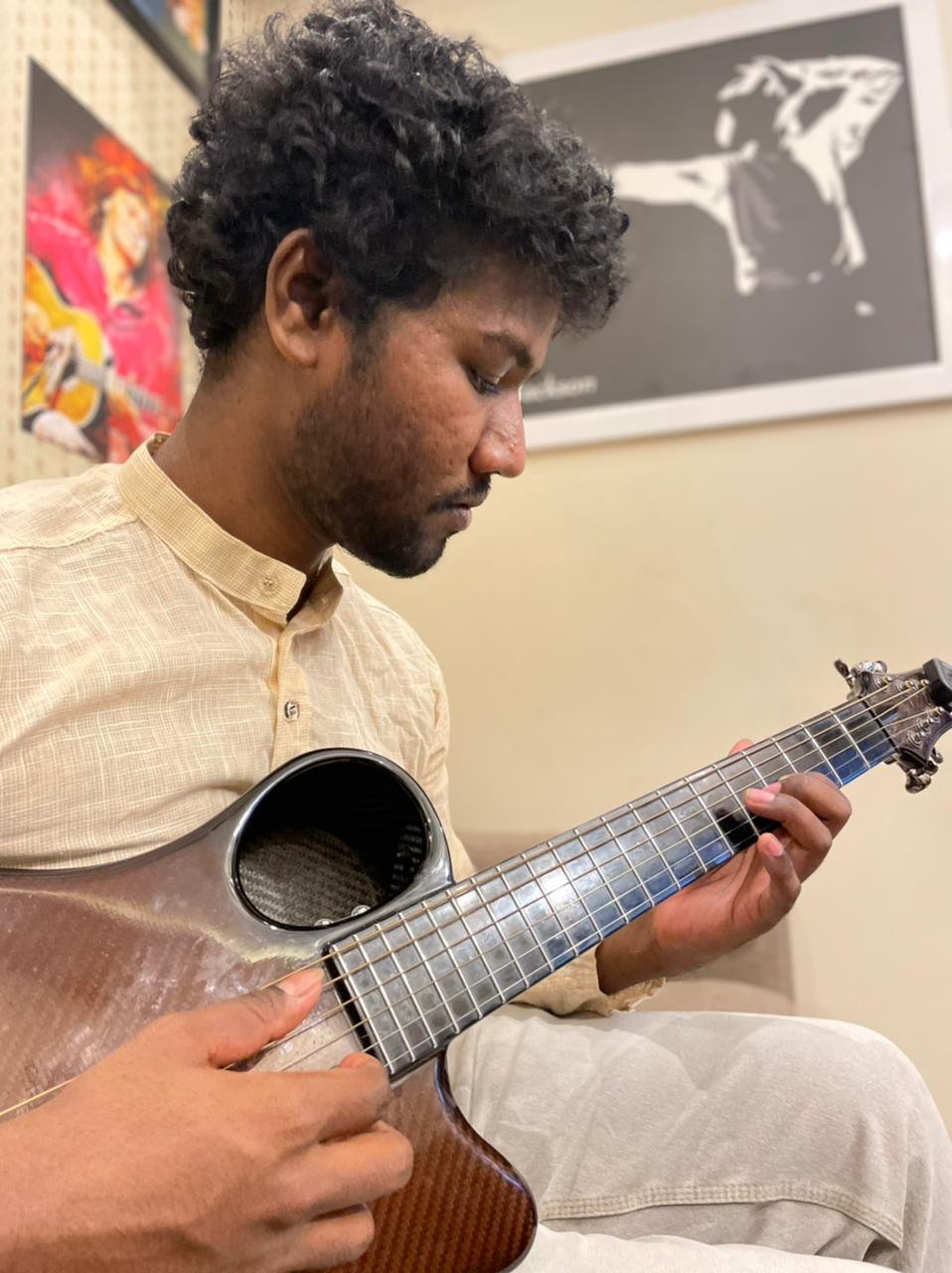 Prashanth Eganthan, promising talent in the field of Carnatic guitar is Disciple of guitar virtuoso Shylu Ravindran. Prashanth began his guitar journey in western classical music and has pursued 5 grades from the trinity college of music, London. Under the guidance of Shylu Ravindran, Prashanth Eganthan ventured into Carnatic guitar and been associated with many projects/ composers and bands. Apart from guitar, Prashanth is also an able keyboard player and percussionist.