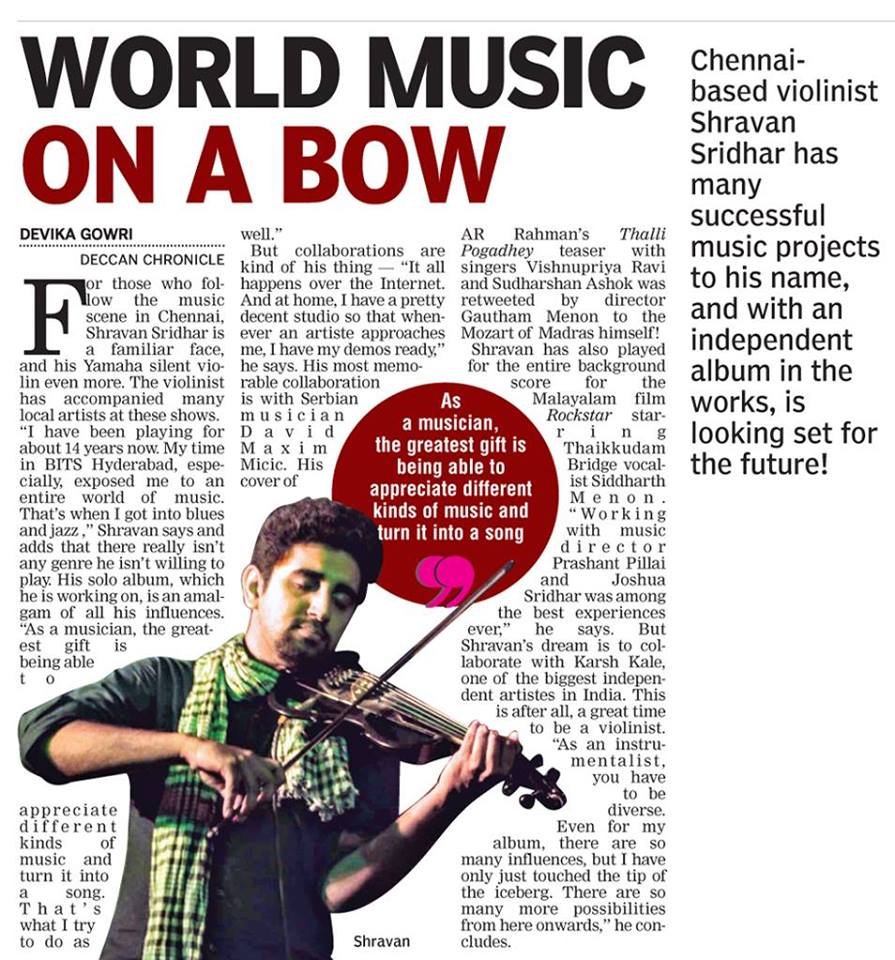Having been trained in Indian Carnatic vocals and violin for 15 years, Shrvan Sridhar is equally at ease with a myriad of genres like blues, country, rock and roll, electronica, western classical and metal. He has been a part of the famed Airtel Super Singer in which he has performed with legends such as Rajesh Vaidhya, Stephan Devassy, Keba Jeramiah, Karthik Devaraj, Nivas Prasanna. He has also performed with singers Haricharan, Jonita Gandhi, Shashaa Tirupati and Sid Sriram in the audio launch of Acham Yenbadhu Madayamida in the presence of the genius composer A R Rahman. He has played for various bands such as Sapta and One Girl Shy. He has done multiple short film scores and movie recordings for music directors like Prashant Pillai, Joshua Sridhar, Ashwath Naganathan. He is one of the most sought-after violinists in South India for live/recording sessions. He has been part of bands that have opened for legends such as Indian Ocean and Strings.