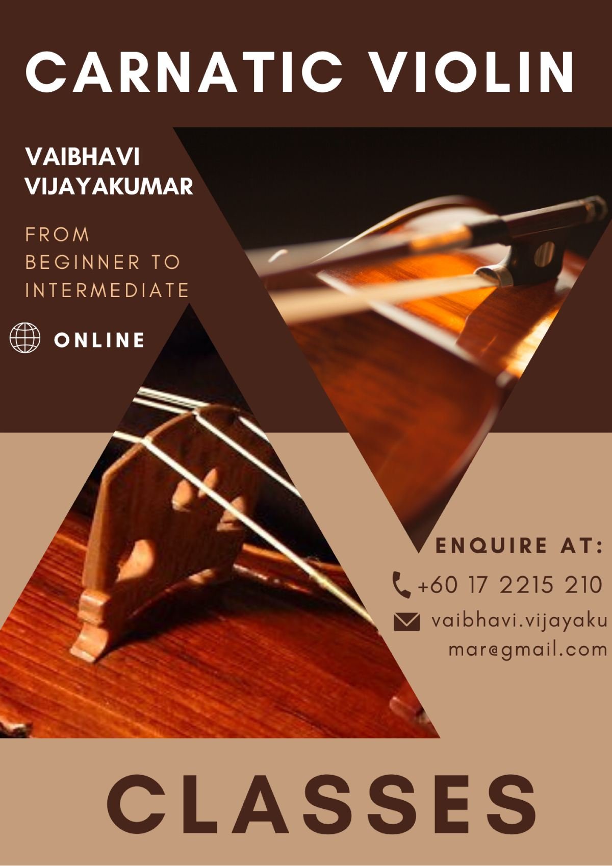 I have been playing the carnatic violin for 5 years. I take online, one to one classes from beginner to intermediate.